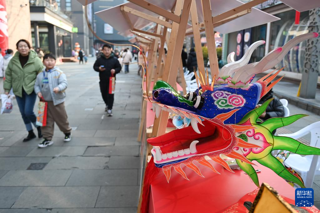 1月28日,市民在吴兴区爱山街道爱山广场的文艺市集上观看“龙头”造型风筝。