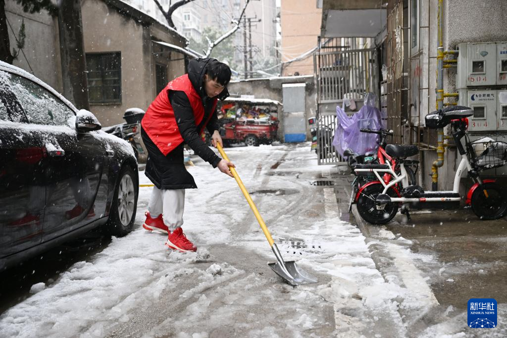 2月4日,在合肥市包河区芜湖路街道兰亭社区,社区工作人员在清扫路面积雪。