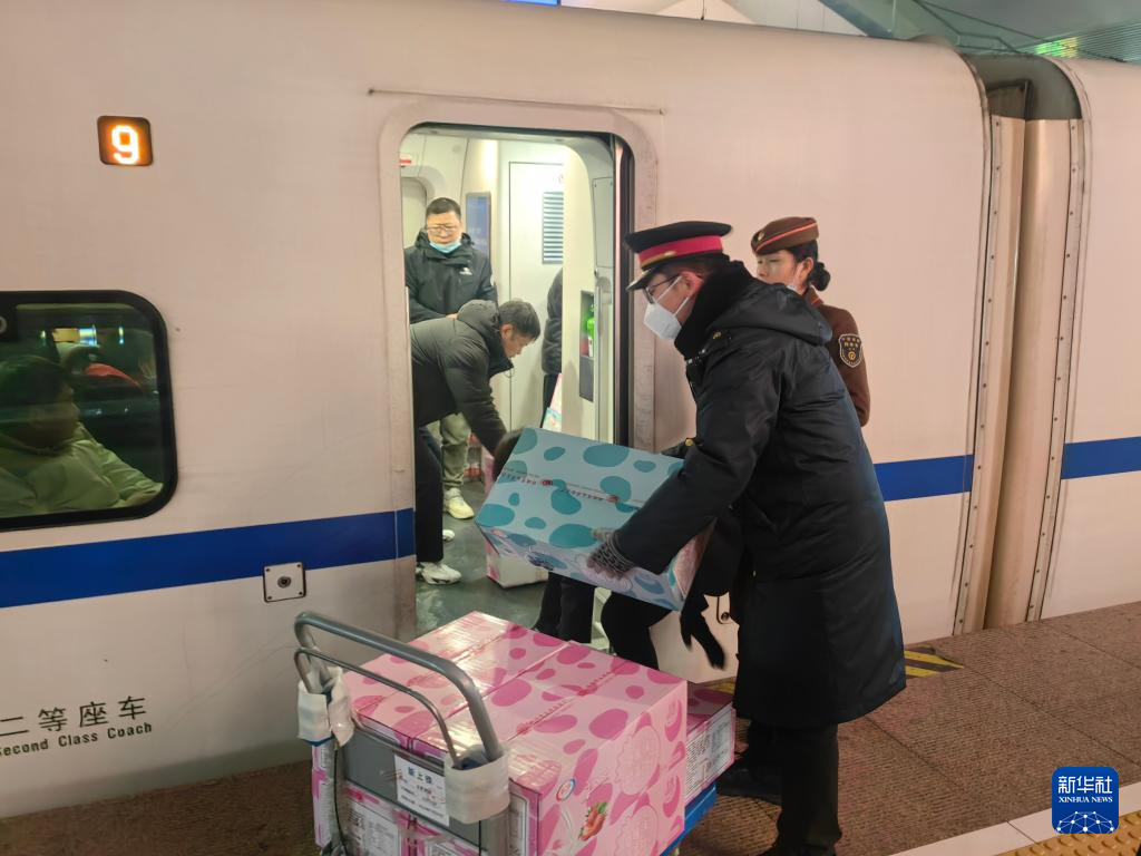 2月5日,在合肥南站,工作人员为晚点列车运送应急储备食品。