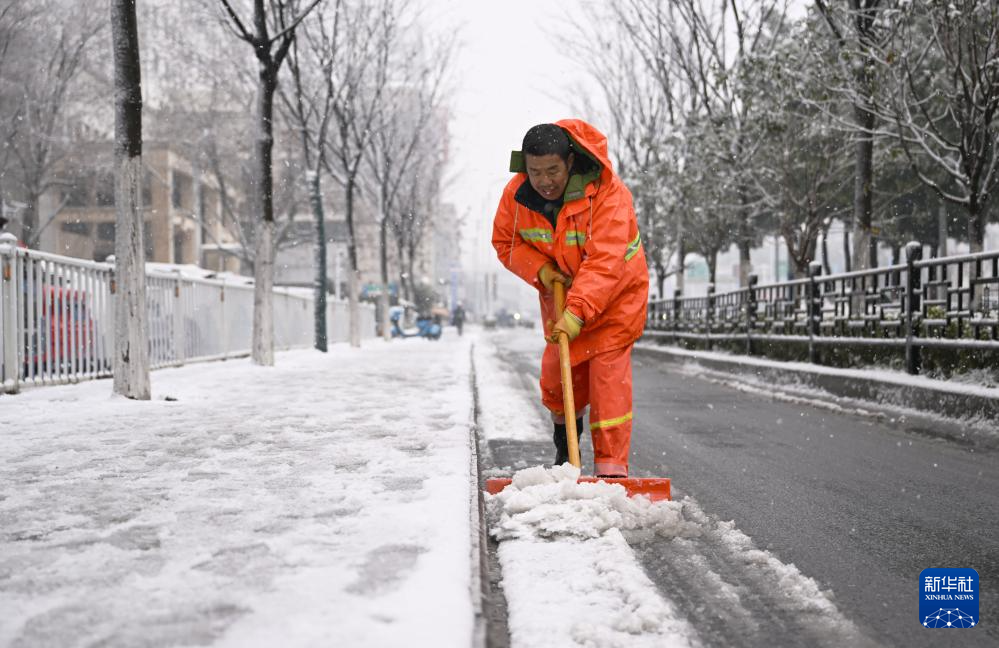 2月4日,在合肥市包河区,环卫工人在清扫路面积雪。