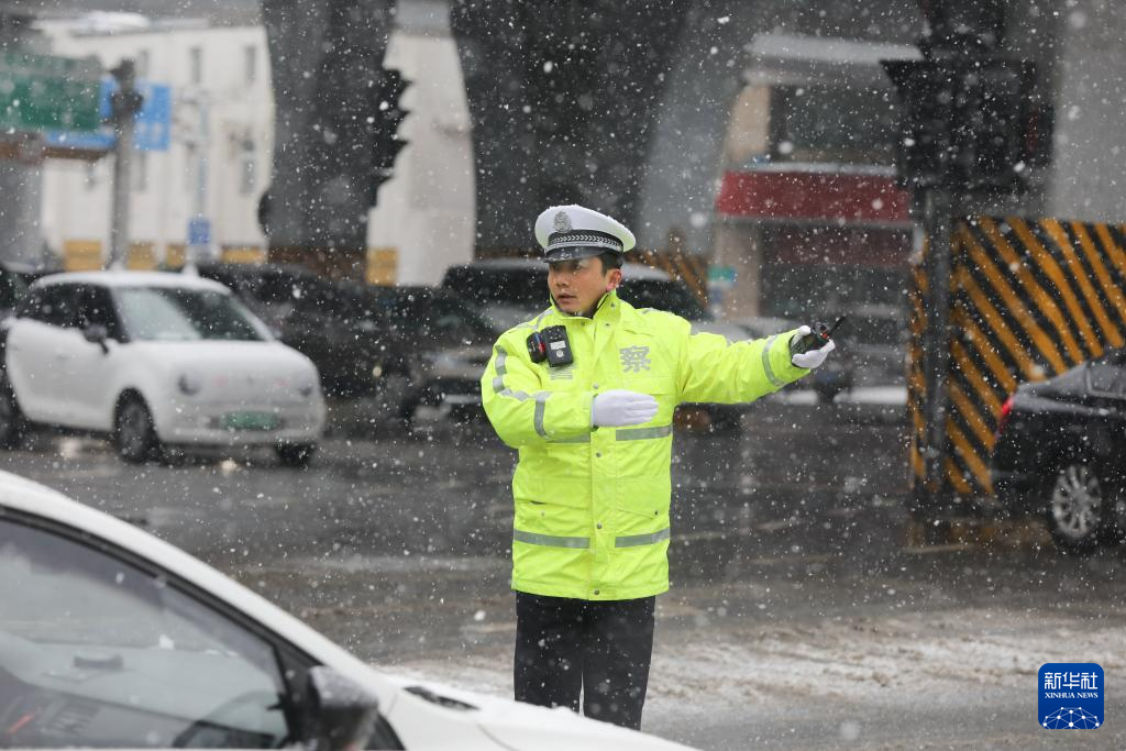2月4日,合肥市公安局交警支队蜀山大队一中队民警在雪中指挥疏导交通。
