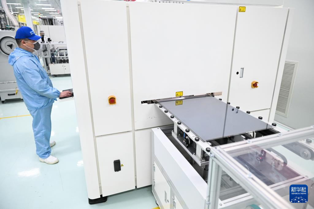 2月29日,在位于无锡市锡山区的极电光能有限公司智能生产车间,钙钛矿光伏组件正在自动化生产线上进行激光划刻工艺。