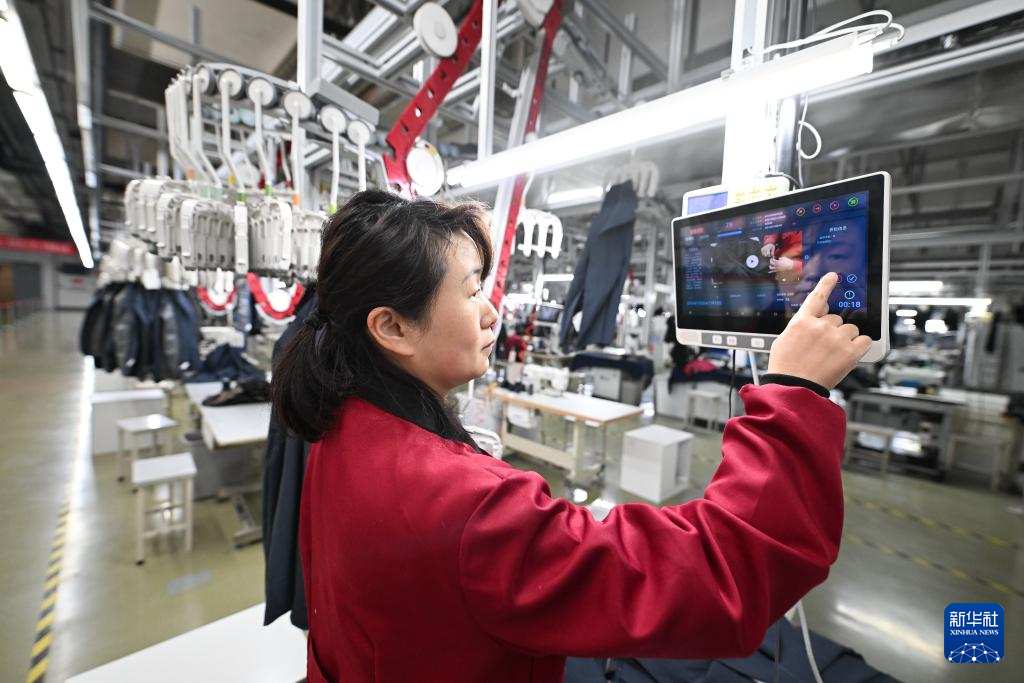 2月29日,在位于无锡市锡山区的红豆股份红豆男装5G智能全连接工厂,检验人员使用吊挂PAD判定产品质量。