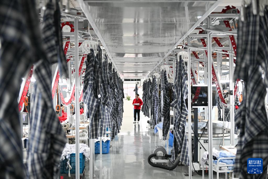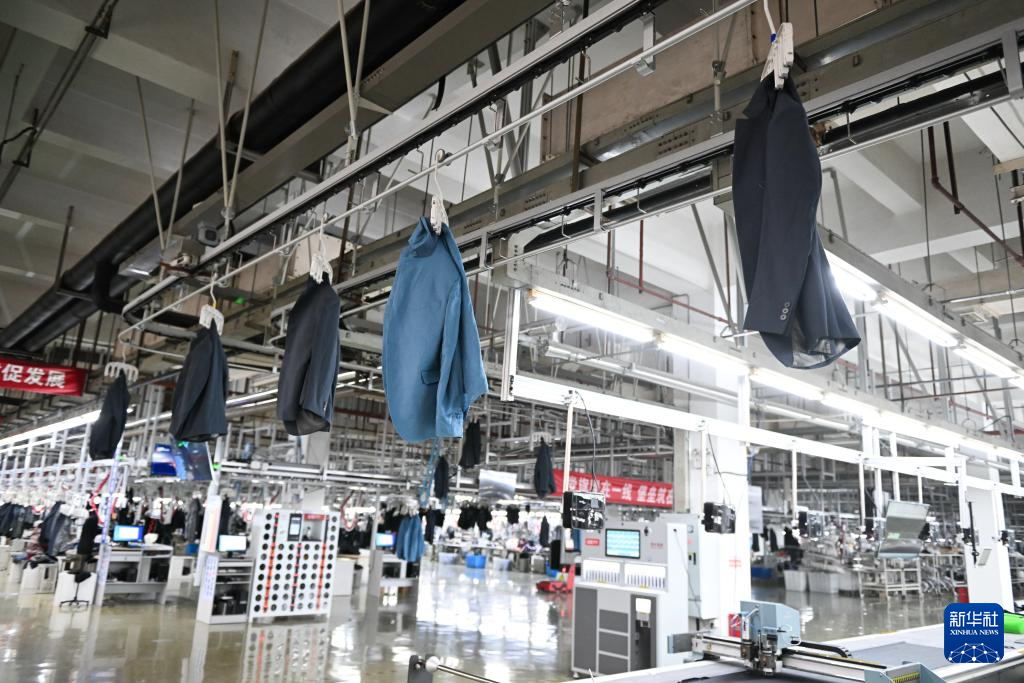在红豆衬衫厂,外贸订单通过智能吊挂线自动进入各生产流程(2月29日摄)。