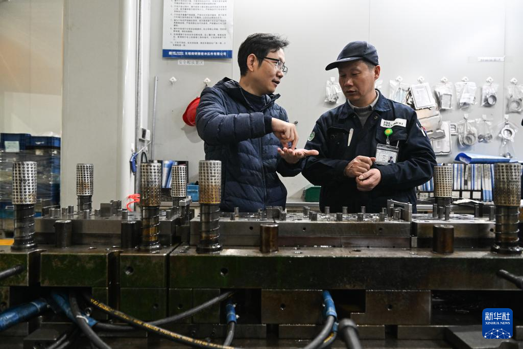 在“江苏省专精特新中小企业”无锡微研精工科技有限公司智能生产车间,技术人员在讨论模具设计(2月28日摄)。