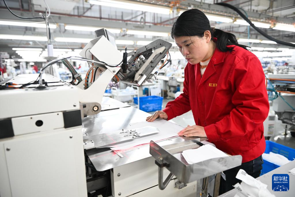 2月29日,红豆衬衫厂员工使用订口袋自动化设备订口袋。