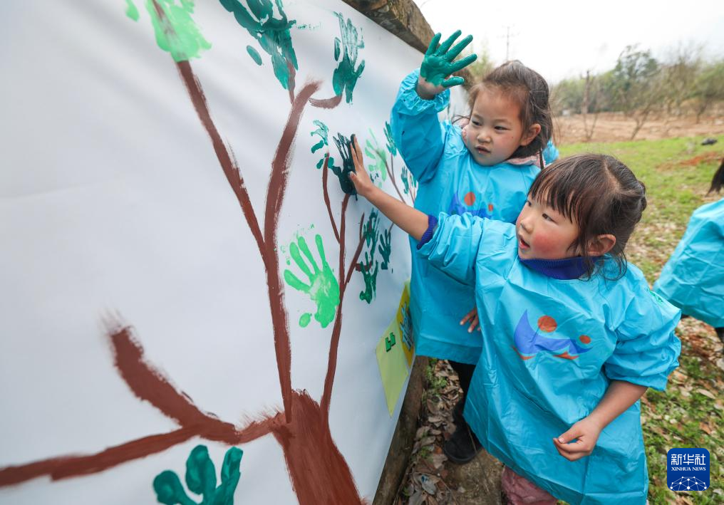 3月7日,诸暨市暨南街道外陈中心村幼儿园的孩子们在暨南街道外陈村创作植树节护绿主题手印画。