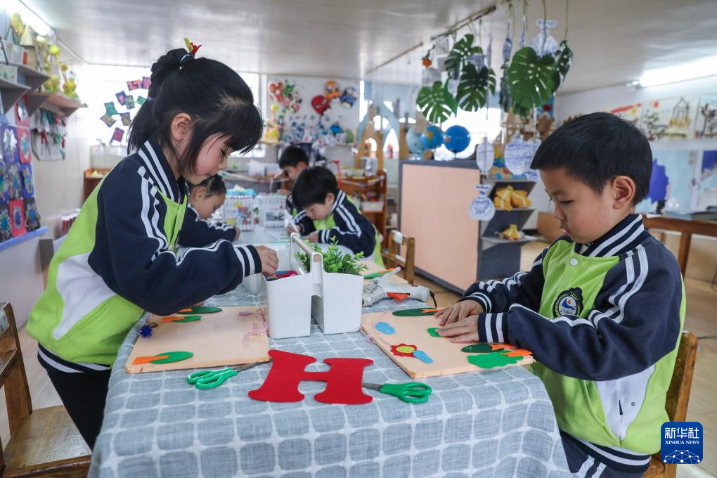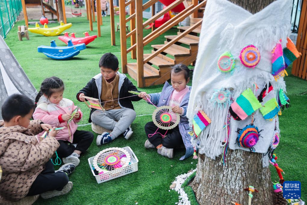 3月7日,诸暨市暨南街道南悦幼儿园开展“植此春色 绿意萌动”护绿添彩活动,孩子们在制作彩色手工艺品,准备挂在树上“为大树穿花衣”。