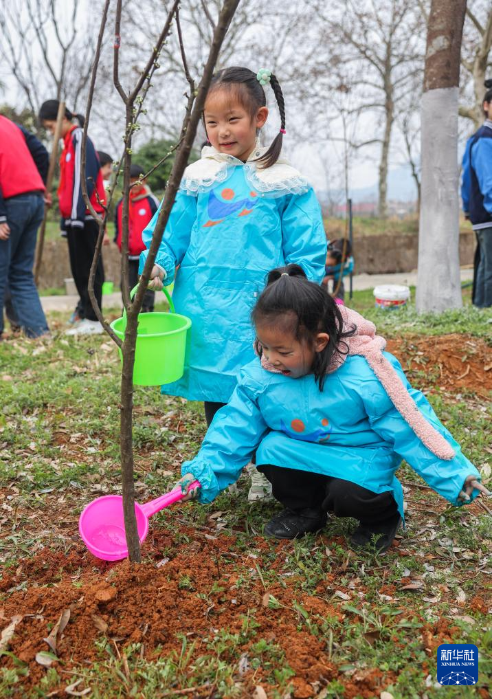 3月7日,诸暨市暨南街道外陈中心村幼儿园的孩子们在暨南街道外陈村给刚种好的树苗浇水。