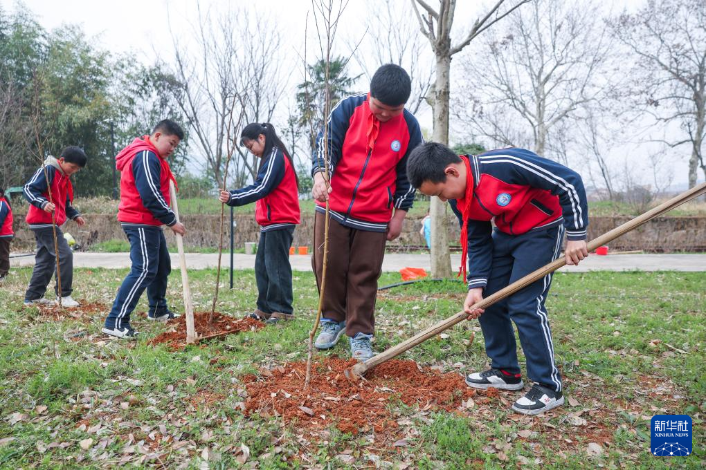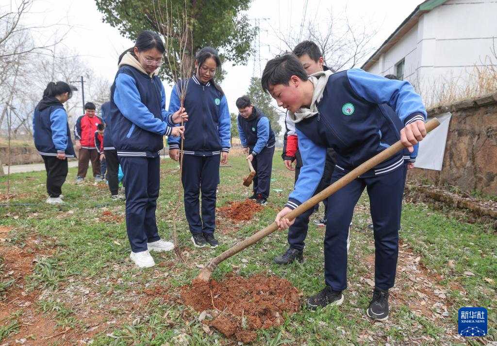 3月7日,诸暨市暨南街道王家井初中的学生们在植树。
