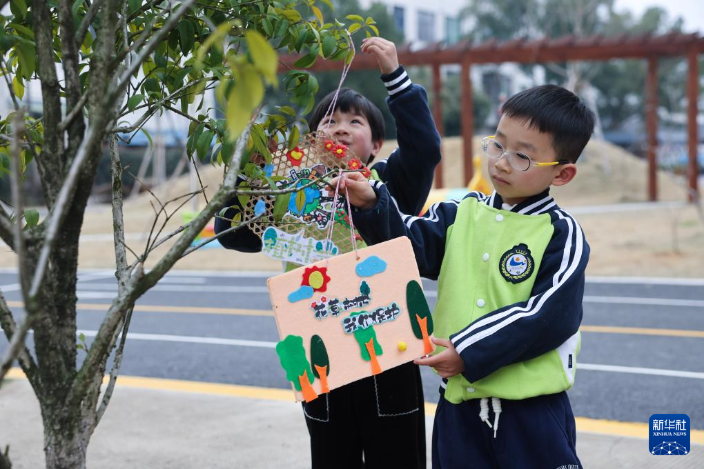 3月7日,诸暨市暨南街道南悦幼儿园开展“植此春色 绿意萌动”护绿添彩活动,孩子们把彩色手工艺品挂在树上“为大树穿花衣”。