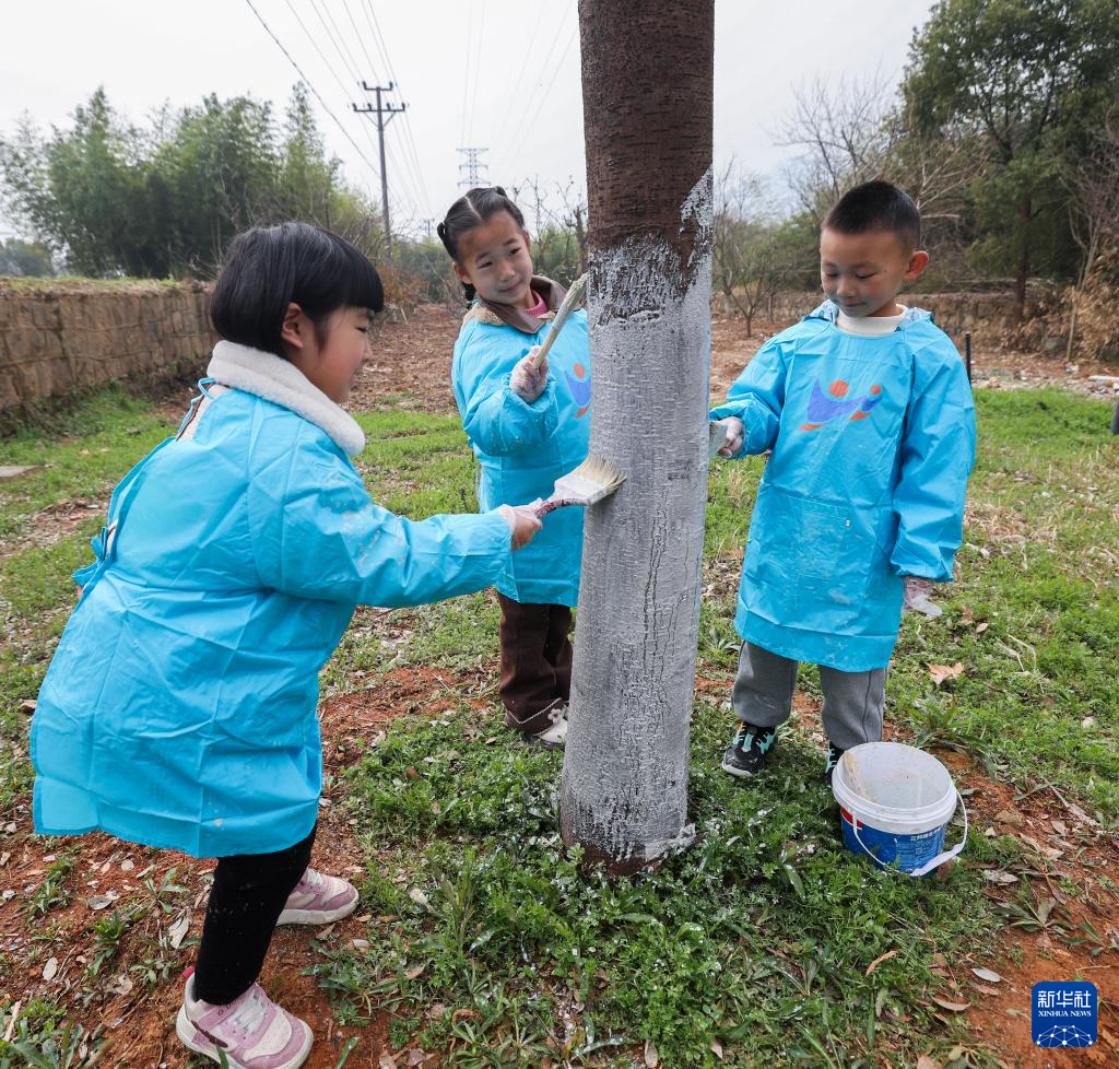 3月7日,诸暨市暨南街道外陈中心村幼儿园的孩子们在暨南街道外陈村给树木刷防虫的白灰。