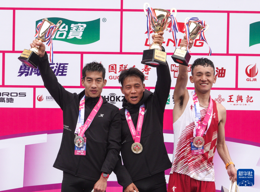 3月24日,冠军何杰(中)、亚军杨绍辉(左)和季军桑吉东知在全国马拉松锦标赛(第一站)男子组颁奖仪式上。