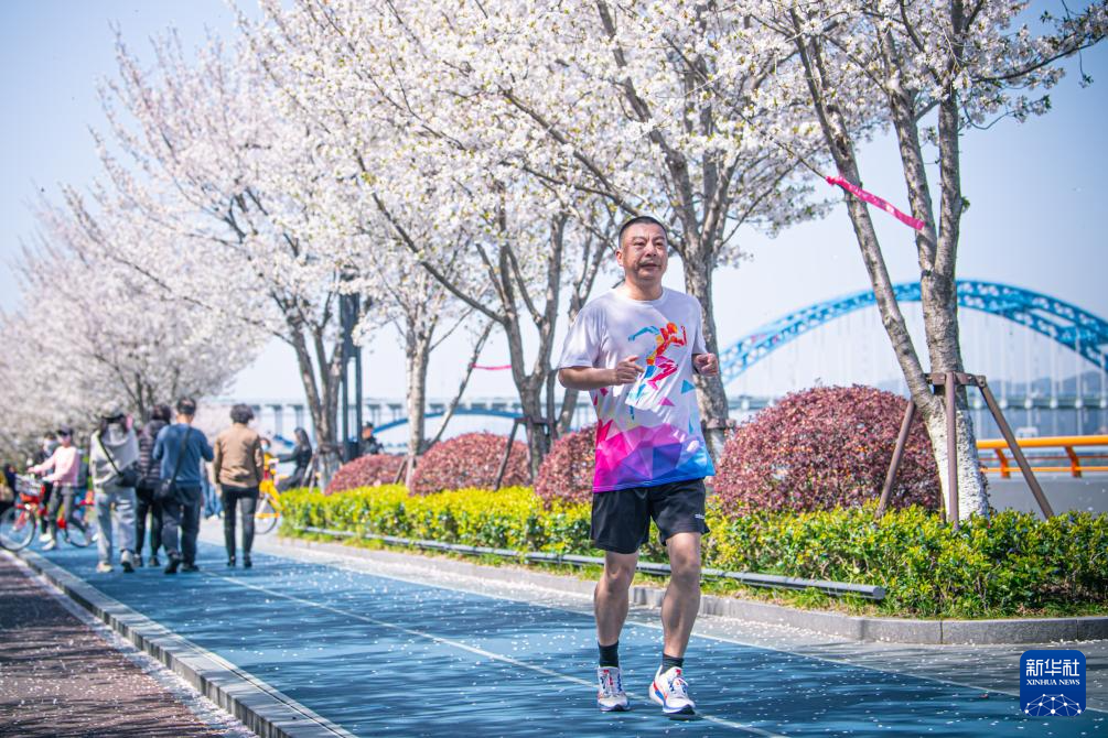 3月29日,市民在杭州市滨江区沿江绿道“樱花跑道”上跑步锻炼。