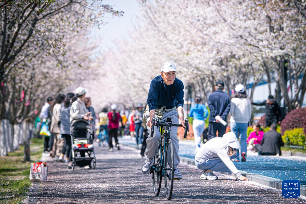 3月29日,市民在杭州市滨江区沿江绿道“樱花跑道”上骑行锻炼。