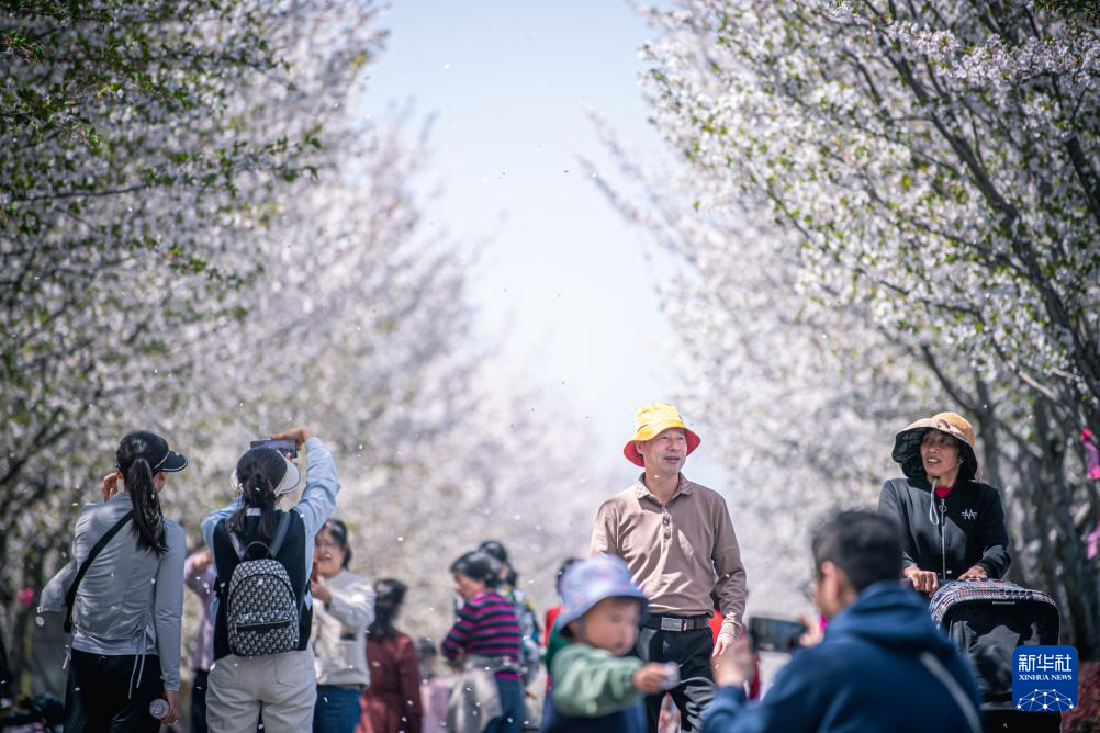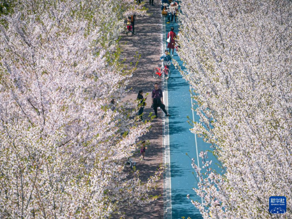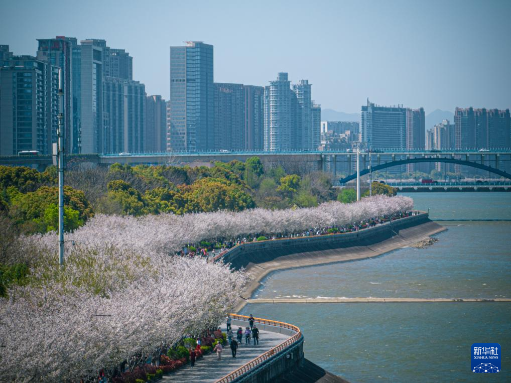 近期,浙江省杭州市滨江区沿江绿道上种植的三千余株樱花次第盛开,形成“樱花跑道”景观,吸引了大批市民前往赏花游玩。