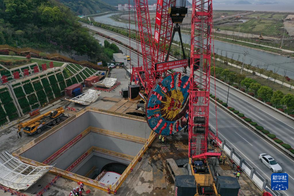 “定海号”盾构机刀盘被履带式起重机从地面吊运至甬舟铁路金塘海底隧道舟山侧盾构始发井(4月5日摄,无人机照片)。