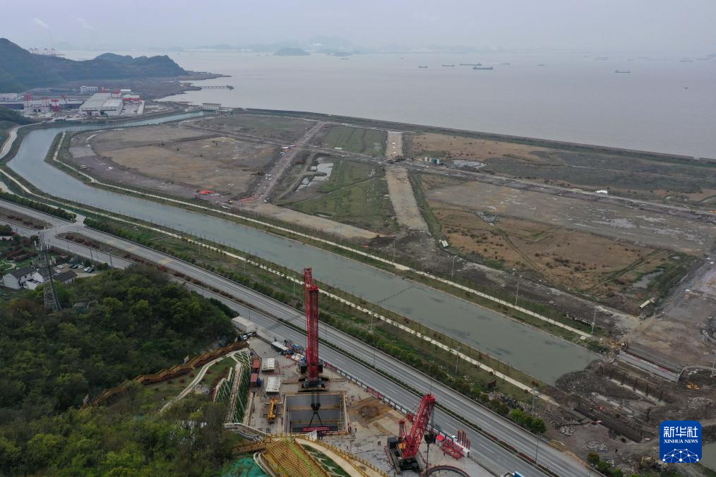 4月5日在舟山市定海区金塘岛拍摄的甬舟铁路金塘海底隧道舟山侧盾构工作井(无人机照片)。