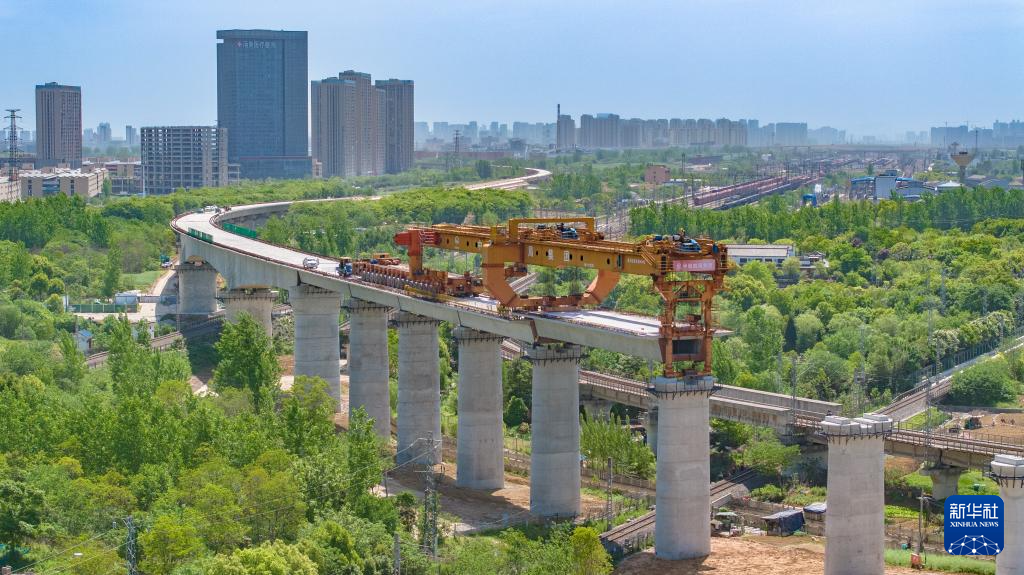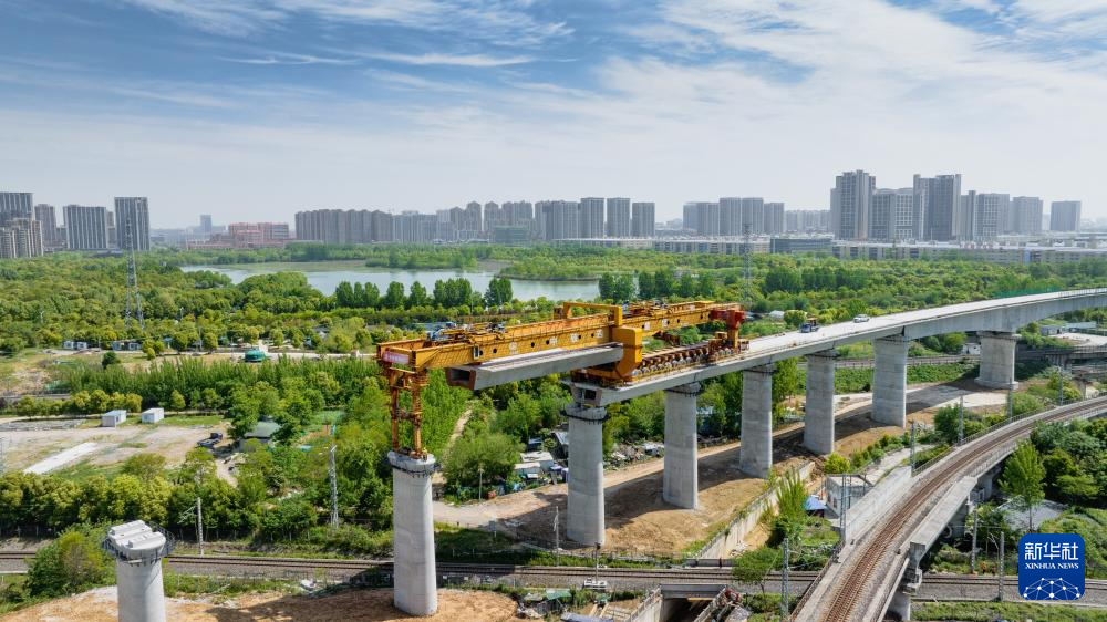 这是合新铁路上跨既有铁路淮南上行线架梁施工现场(4月24日摄,无人机照片)。