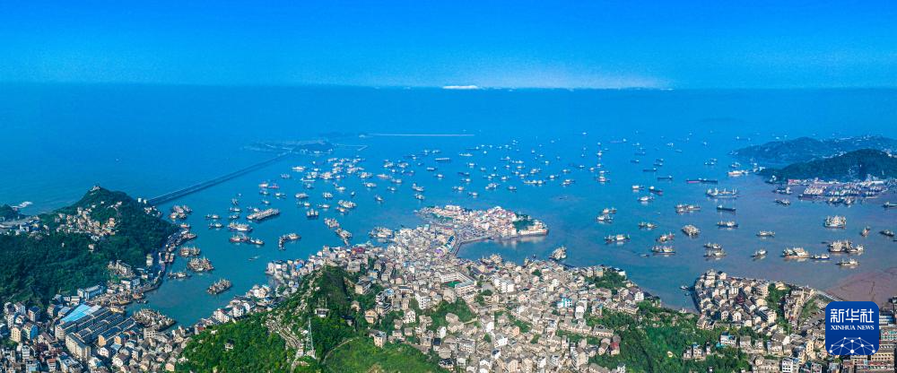4月29日,浙江省温岭市石塘镇箬山渔港内停泊着归港的渔船(无人机照片)。
