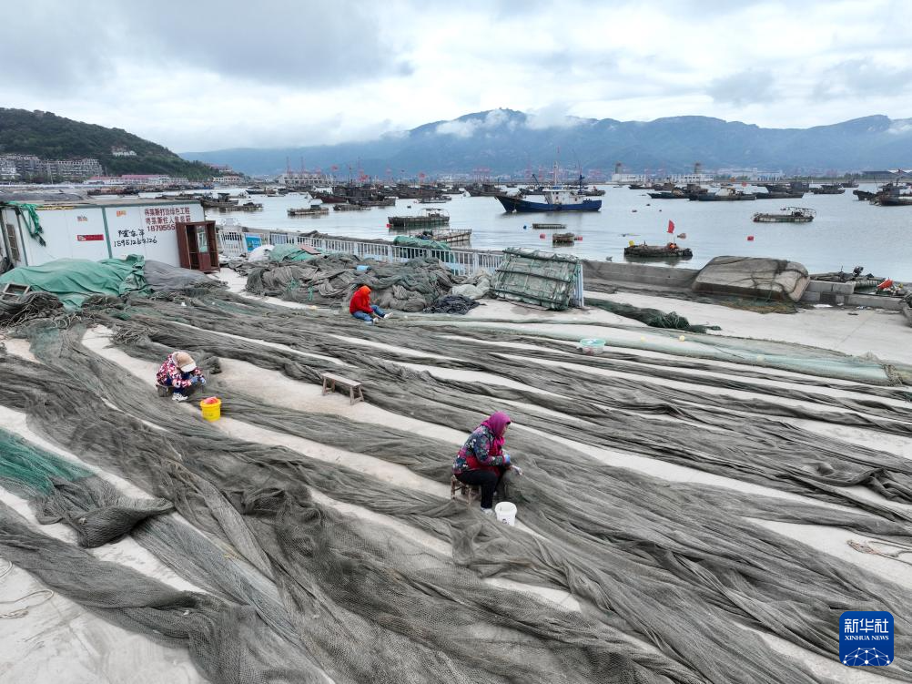 4月28日,在江苏省连云港市连岛中心渔港码头,渔民在修补渔网(无人机照片)。
