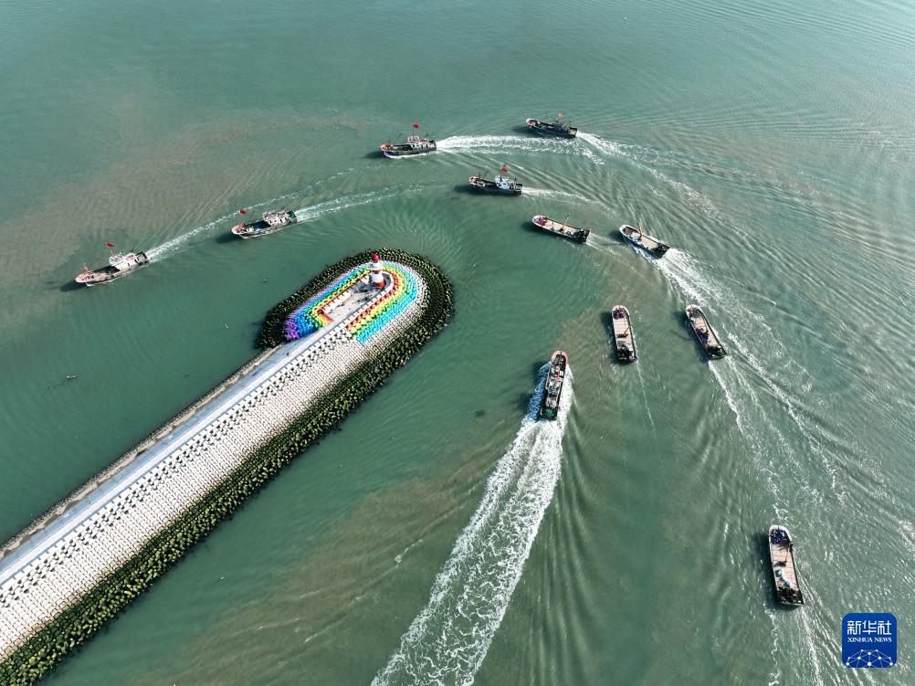 4月29日,在江苏省连云港市连岛中心渔港码头,渔船纷纷返港准备休渔(无人机照片)。
