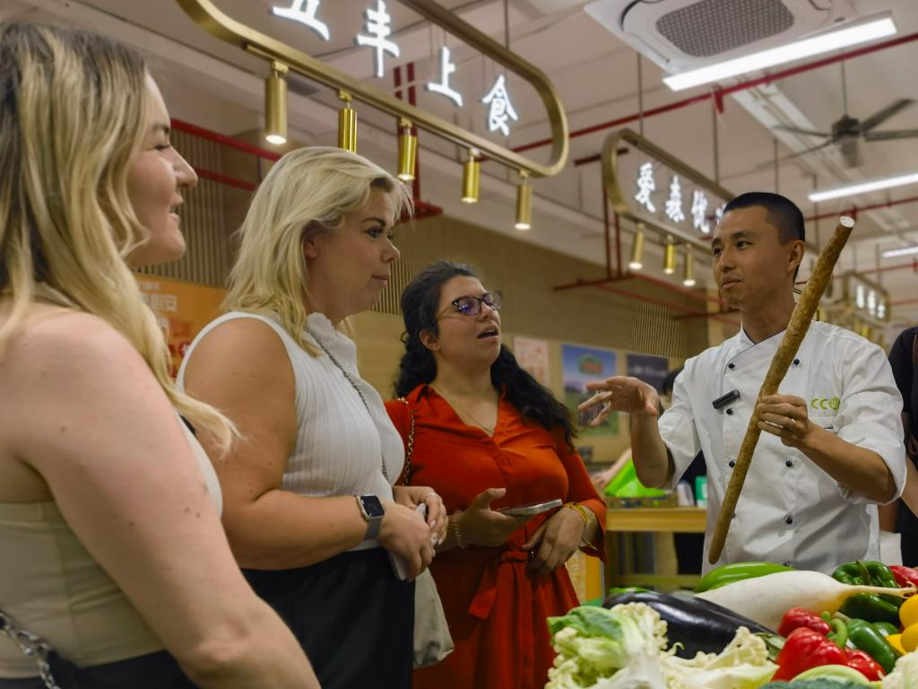 29日,在参加2024 ITB上海国际旅游交易博览会之际,来自英国、加拿大、冰岛等国的商旅客人在上海逛菜市场,并来到位于上海居民小区的一处厨艺工作室学习做小笼包、扬州炒饭等美食,体验“做一天上海人”。