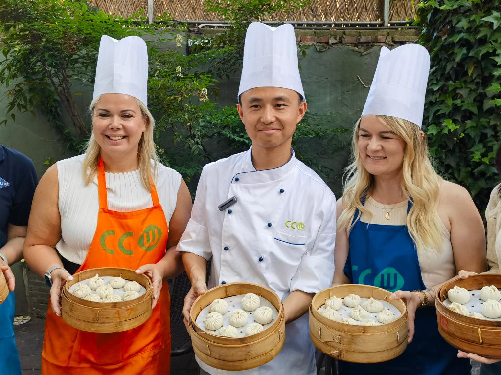 外国游客手持各自包好的小笼包合影。新华社记者 陈爱平 摄