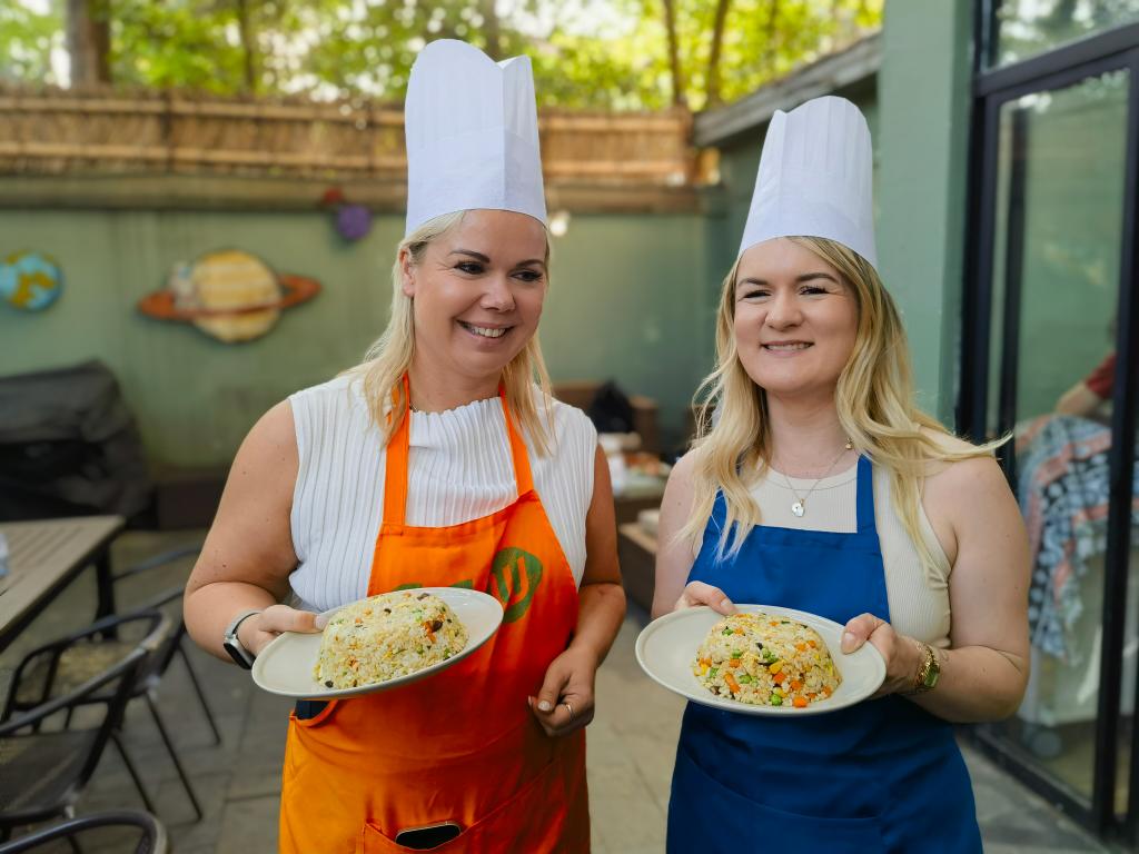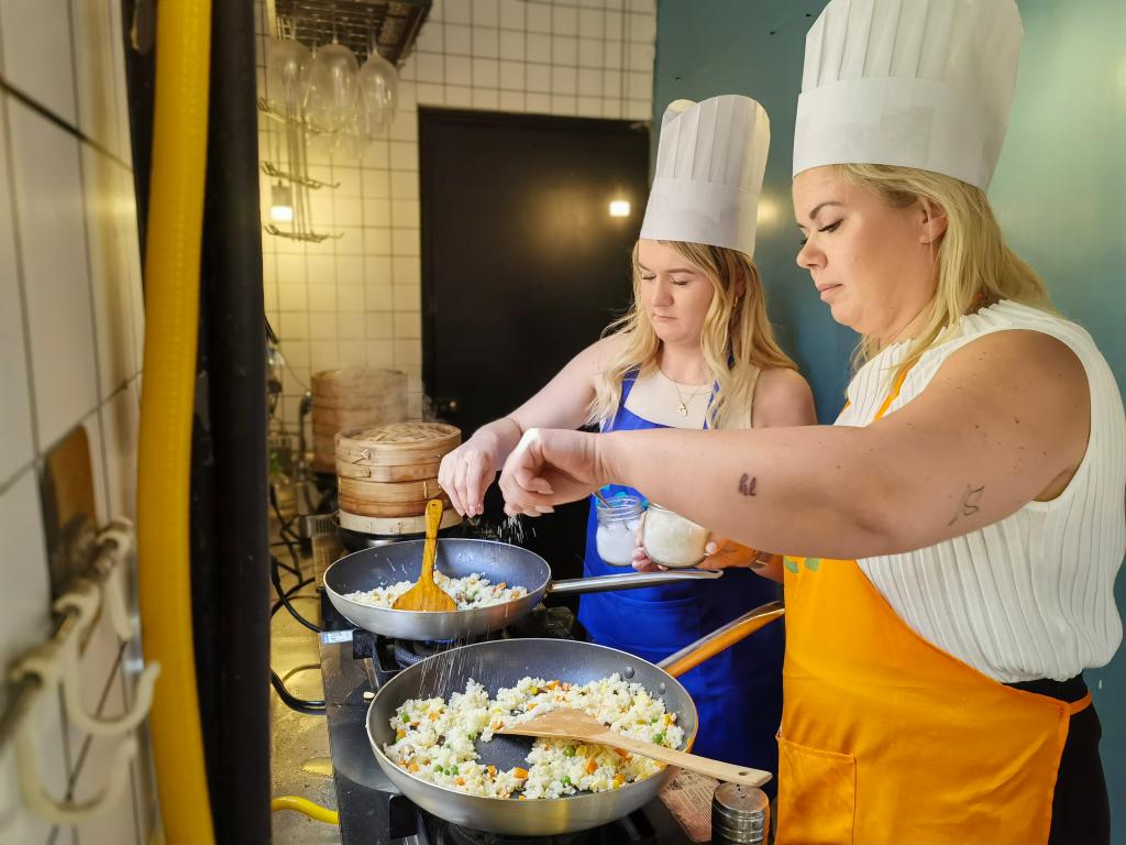 入境游客使用上海市民常用厨具,学做扬州炒饭。新华社记者 陈爱平 摄