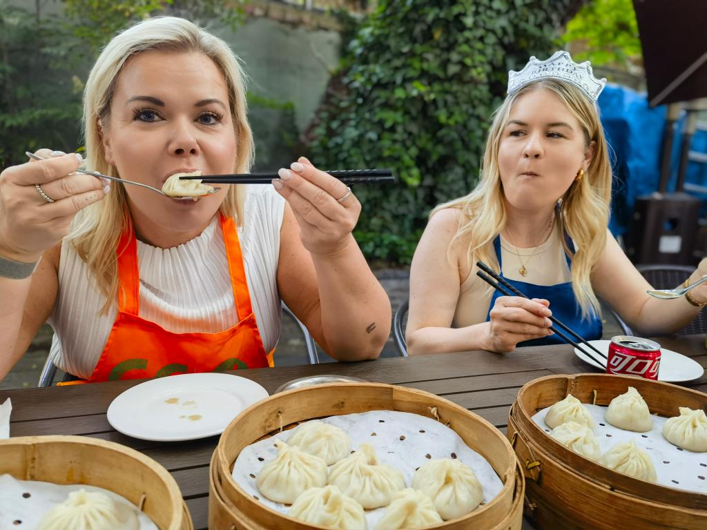 外国游客品尝自己亲手做的小笼包。新华社记者 陈爱平 摄