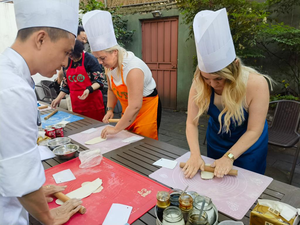入境游客在师傅的指导下擀面。新华社记者 陈爱平 摄