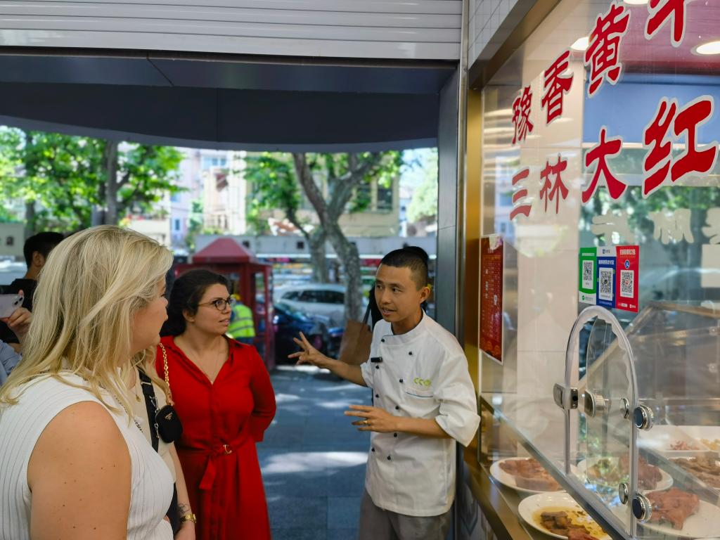 在上海广元市集,师傅向外国游客介绍上海居民常买的熟食。新华社记者 陈爱平 摄
