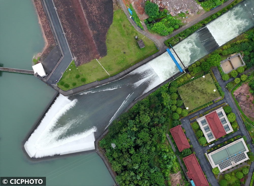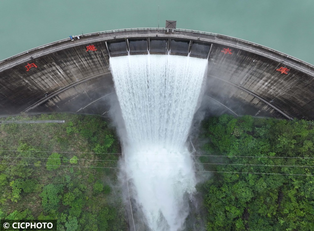 以上图片:2024年6月17日,浙江省武义县内庵水库溢洪,滚滚水流从溢洪道倾泻而下,成了一道壮观的风景。(无人机照片)CICPHOTO/张建成 摄