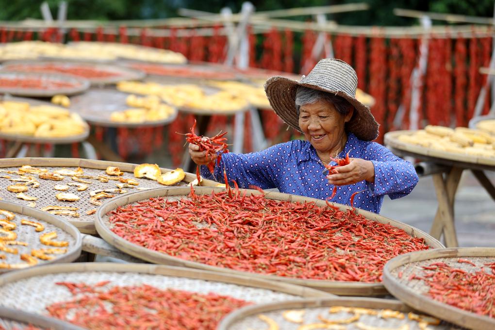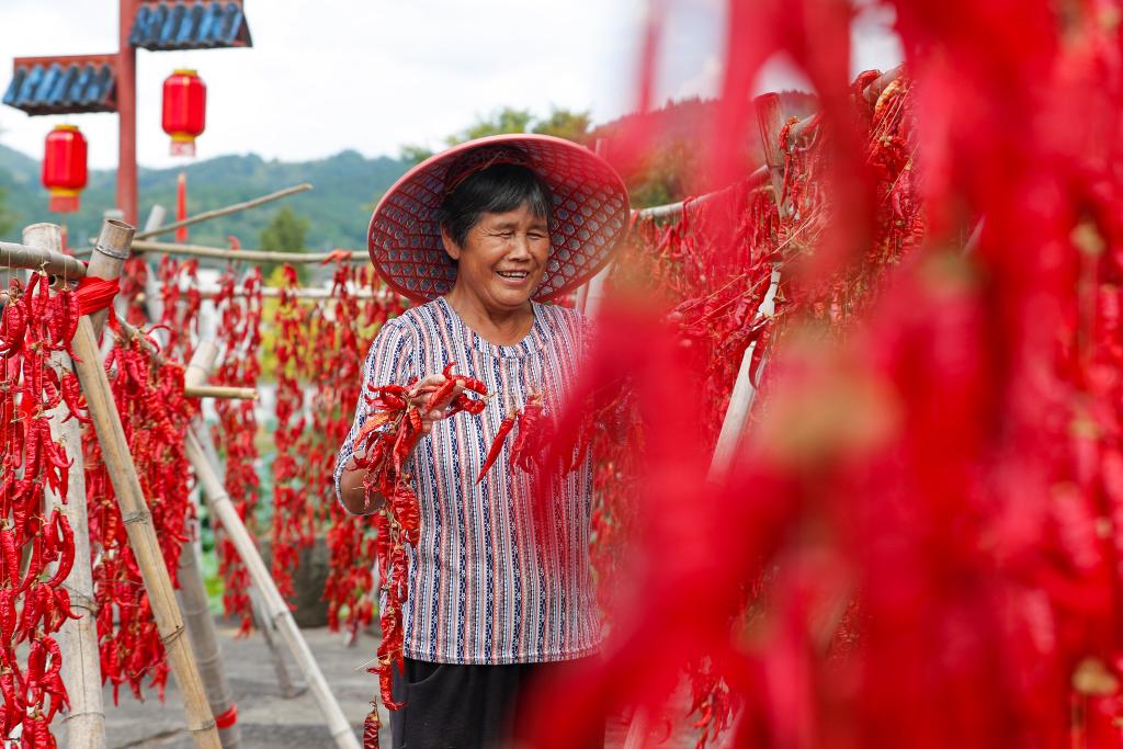 8月19日,在安徽省黄山市徽州区呈坎村,村民在晒场上晾晒红辣椒。
