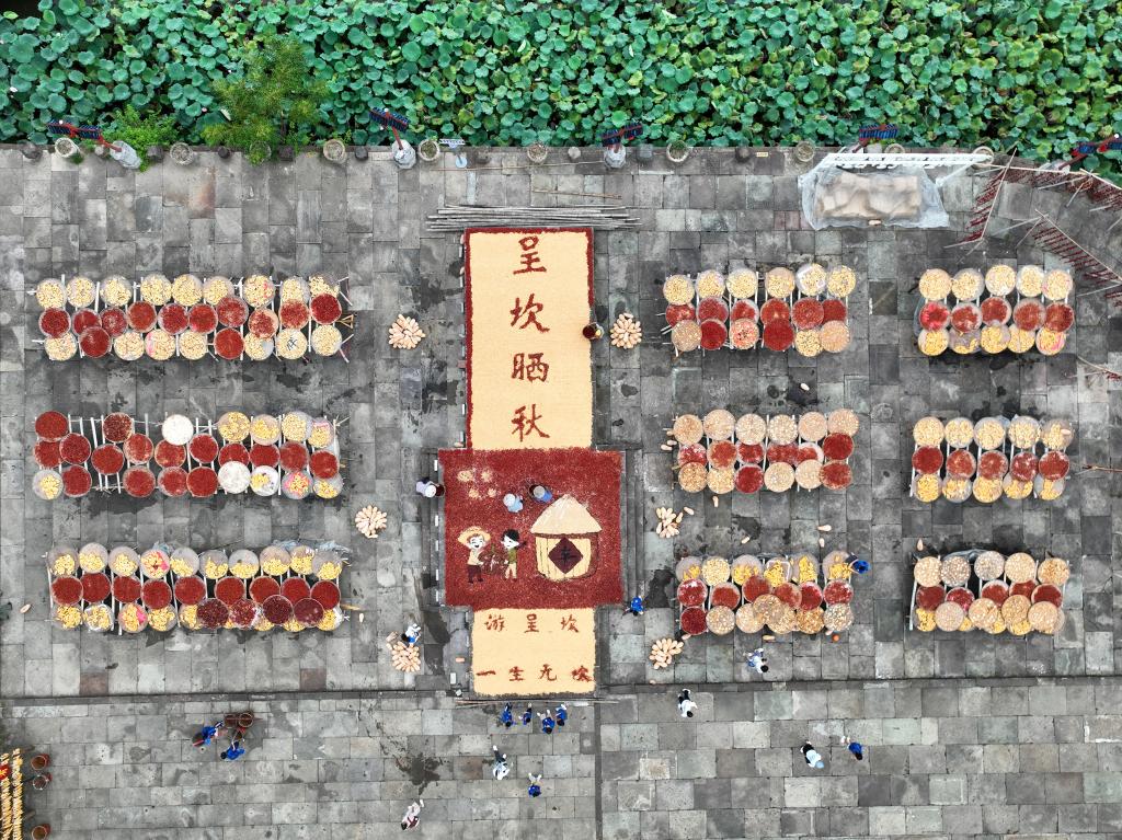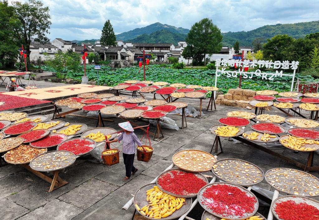 进入秋季,安徽省黄山市徽州区呈坎村村民趁着晴好天气,晾晒玉米、南瓜、红辣椒等农作物,吸引不少游客前往观赏,感受丰收的喜悦。