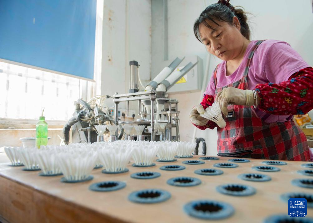 9月24日,在位于安徽省芜湖市无为市的一家体育用品公司,工作人员在注胶操作间检查注胶后的羽毛球产品。
