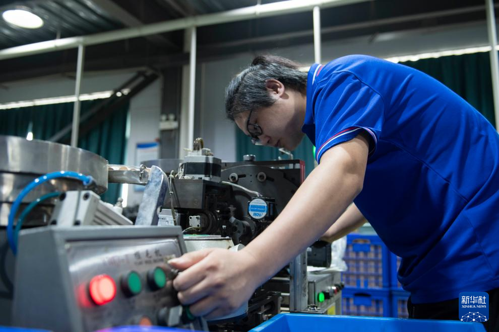 9月24日,在位于安徽省芜湖市无为市的一家体育用品公司,工作人员在车间内调试羽毛球植毛机。