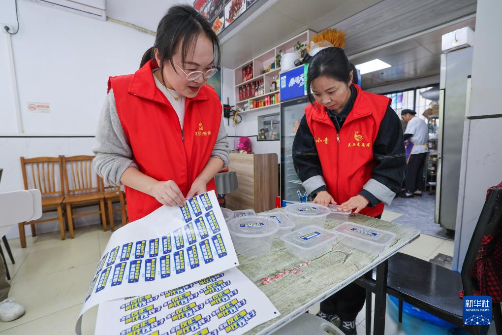 10月29日,在龙泉街道学士府社区的餐饮店,党员志愿者在打包盒上张贴反诈骗贴纸,通过这种方式扩大宣传的范围和效果。