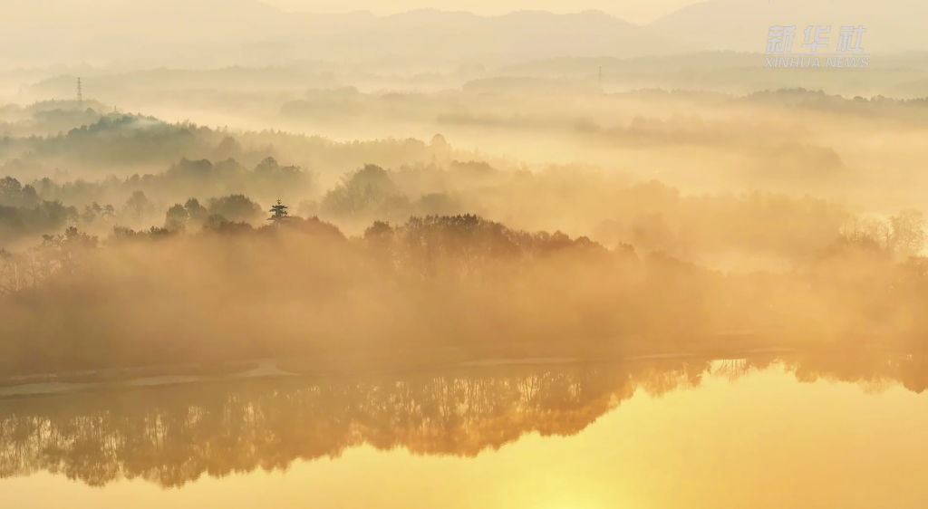 树木、山峦在雾气氤氲中忽隐忽现,宛如一幅水墨画卷。
