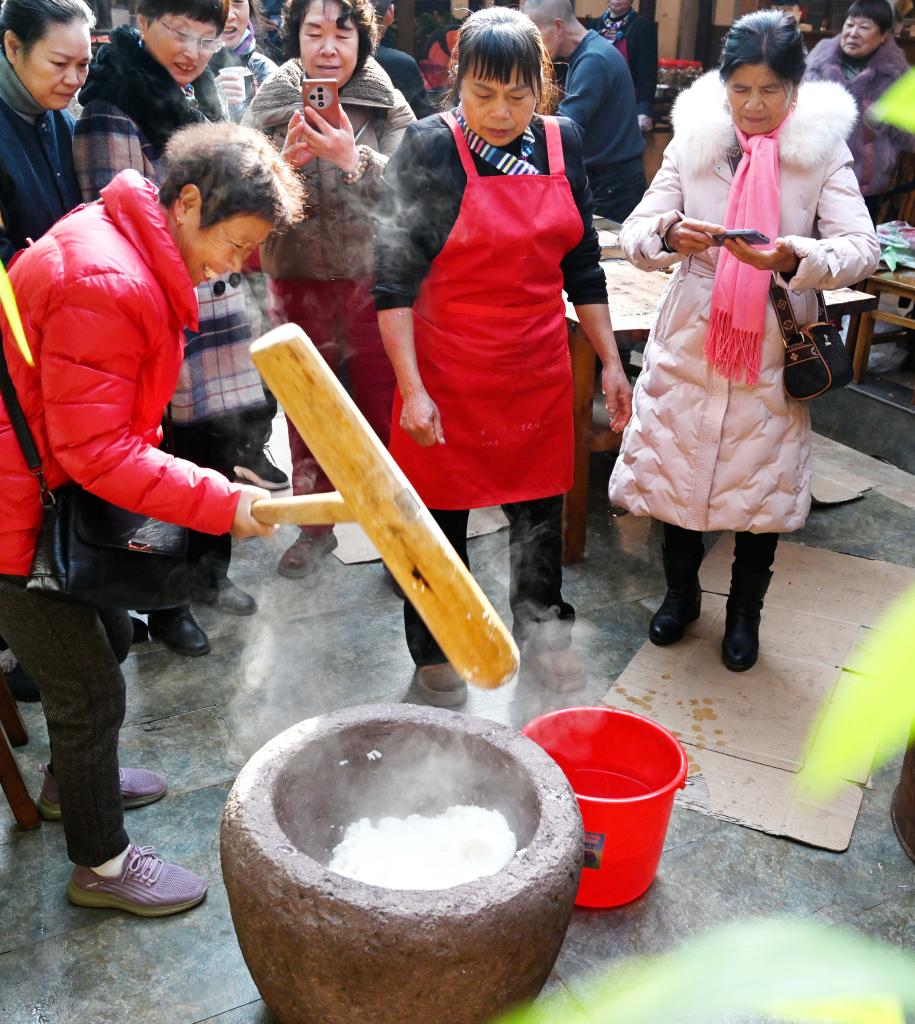 12月20日,浙江省金华市武义县一家农家乐员工与游客体验手工石臼打糍粑。