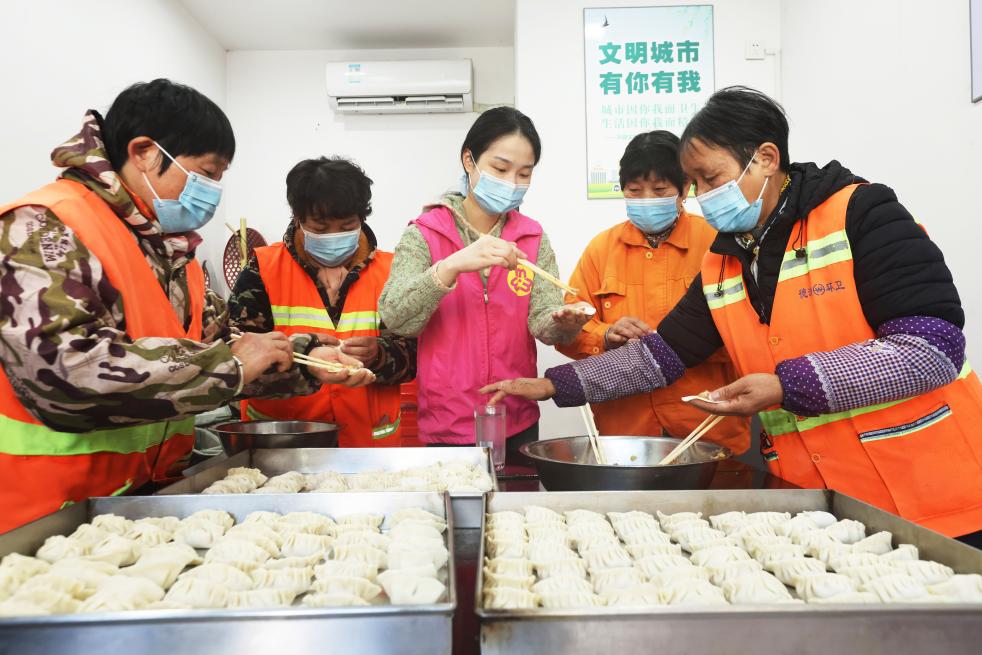12月20日,在浙江省湖州市德清县乾元镇环卫工人爱心驿站,志愿者和环卫工人一起包饺子。