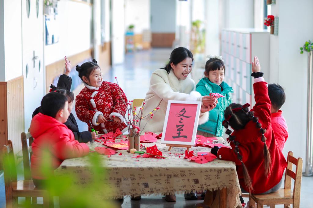 12月20日,在江苏省兴化市陈堡镇中心幼儿园,老师指导小朋友们学习剪窗花。