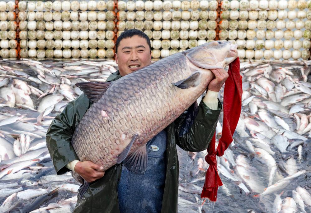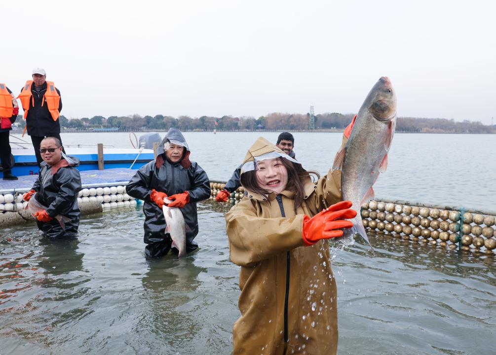 1月11日,渔民在泰州市姜堰区溱湖冬捕作业现场展示刚捕获的“溱湖鱼王”。