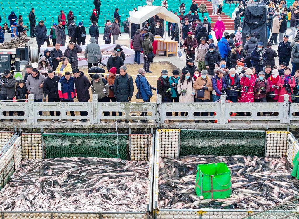 当日,江苏省泰州市姜堰区溱湖冬捕节开幕,湖区水域呈现出一派鱼跃人欢的丰收景象。