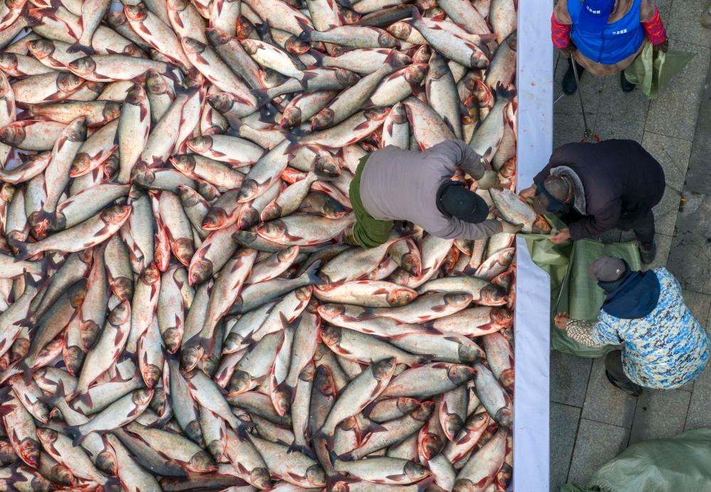 1月11日,渔民在泰州市姜堰区溱湖冬捕作业现场将刚捕获的鱼装车(无人机照片)。
