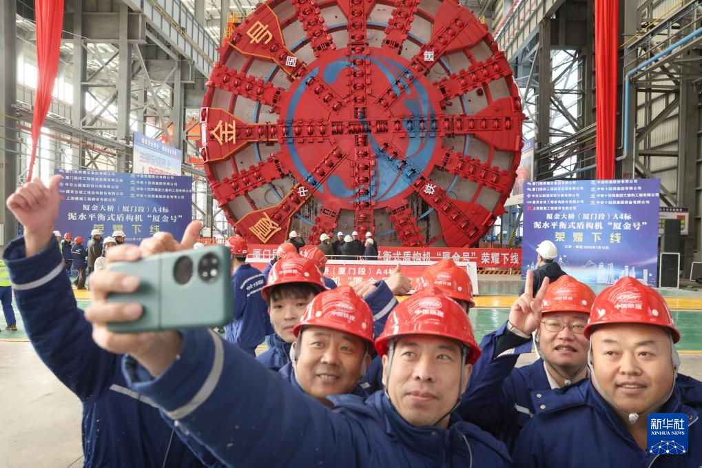 1月15日,工人在当日下线的“厦金号”盾构机前合影。