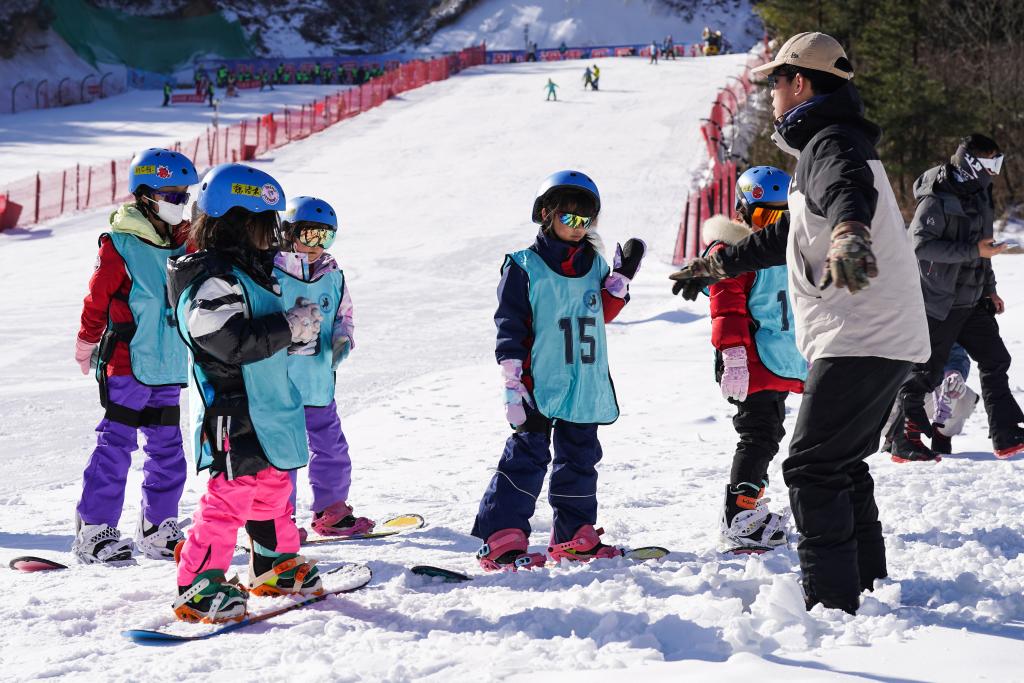 1月15日,小朋友在教练的指导下学习滑雪动作。
