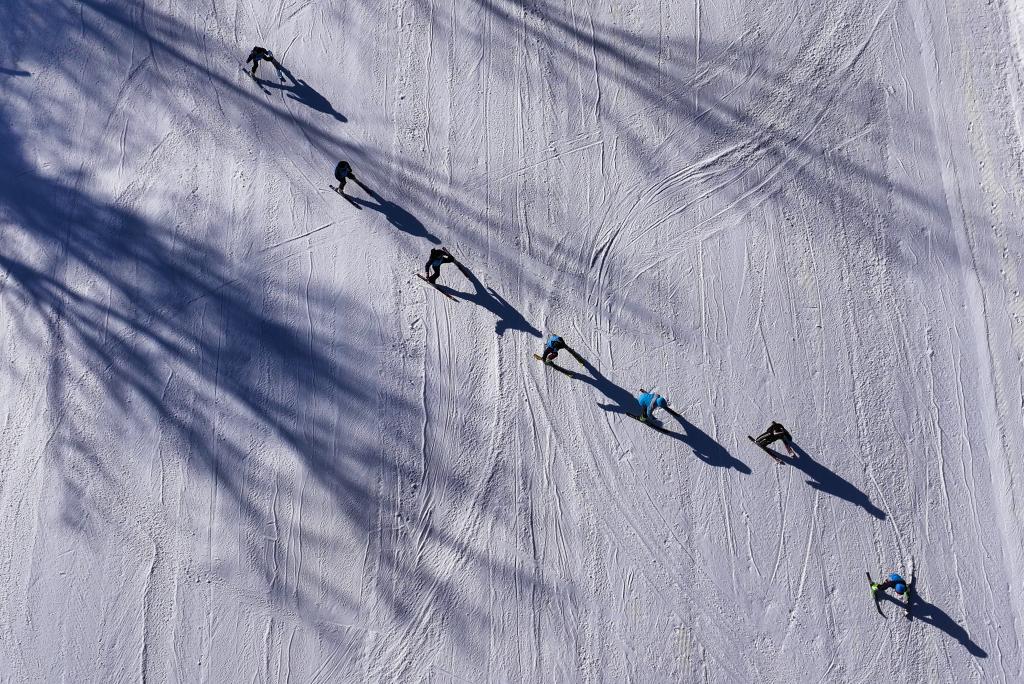 1月15日,人们在雪道上滑行(无人机照片)。