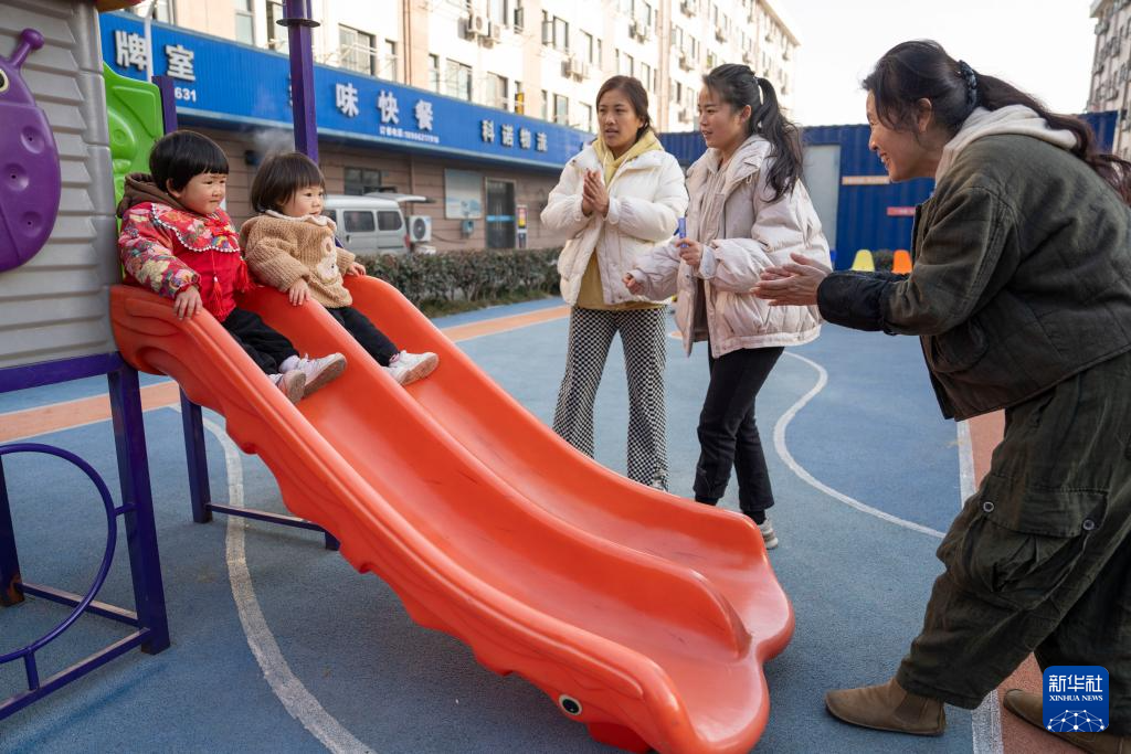 1月8日,在宁波市北仑集运基地后勤区域的“卡娃一米园”,卡嫂带着孩子滑滑梯。