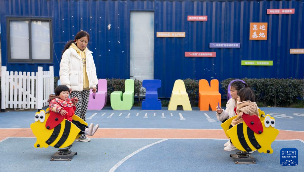 1月8日,在宁波市北仑集运基地后勤区域的“卡娃一米园”,卡嫂带着孩子做游戏。